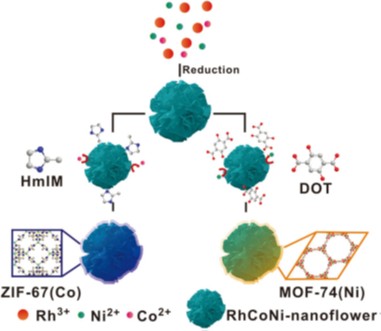 图1 合成RhCoNi@ZIF-67(Co)和RhCoNi@MOF - 74 (Ni) 的示意图.