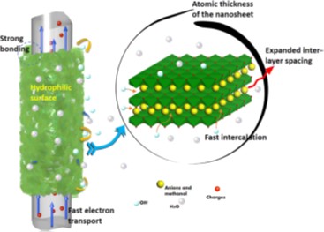 Wang等采用一步溶剂热反应合成了一种直接生长在柔性碳纤维布(NiCo-LDH/ CFC)上的超薄镍钴层状双氢氧化物纳米薄片。以2-甲基咪唑为络合物,甲醇为溶剂,制备的NiCo-LDH/CFC表现出(003)晶面优先生长和层间间距扩大的结构,形成独特的三维多孔纳米结构,纳米片厚度约为57nm,具有较高的储能性能。通过控制前驱体溶液中Ni/Co的比值为4:1,在电流密度为1 A g-1时,电极的比电容为2762.7 F g-1 (1243.2 C g-1)。在Ni/Co = 1:1的最佳比例下,在1A g−1时,其比电容为2242.9 F g−1 (1009.3 C g−1)。此外,在电流密度为60 A g−1的情况下,可保留61%的原始电容,具有优良的倍率性能。基于NiCo- LDH/CFC的混合超级电容器(HSC)的最大能量密度为59.2 Wh kg-1,功率密度为34 kW kg-1。长期稳定性试验表明,在5000次循环后,HSC仍保留了82%的原电容。同时,HSC具有良好的柔韧性,HSC的电化学性能在器件弯曲达180度时基本没有变化。所以,合成的NiCo-LDH/CFC材料的性能表明了该材料在储能器件中提供高能量密度和高功率密度的巨大潜力。