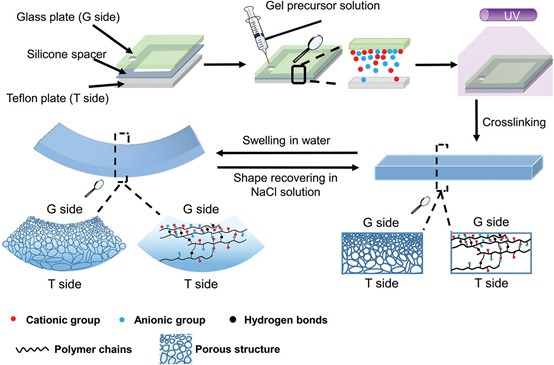 用于湿粘合的干聚合物交联;与湿水凝胶不同,干聚合物分两步快速并牢固地粘附在湿材料上。首先,干燥的聚合物网络会发生水合和溶胀以去除界面水。除表面水后,干燥的聚合物网络与被粘物的湿材料相互作用以实现粘合。当分子(大分子单体或聚合物)穿过水合层并与基材的反应基团或聚合物网络结合时,粘合剂和湿表面之间通常会发生粘附 [7]。然而,这个过程是时间由于大分子的低扩散性而消耗,并且通常需要较长的固化时间。